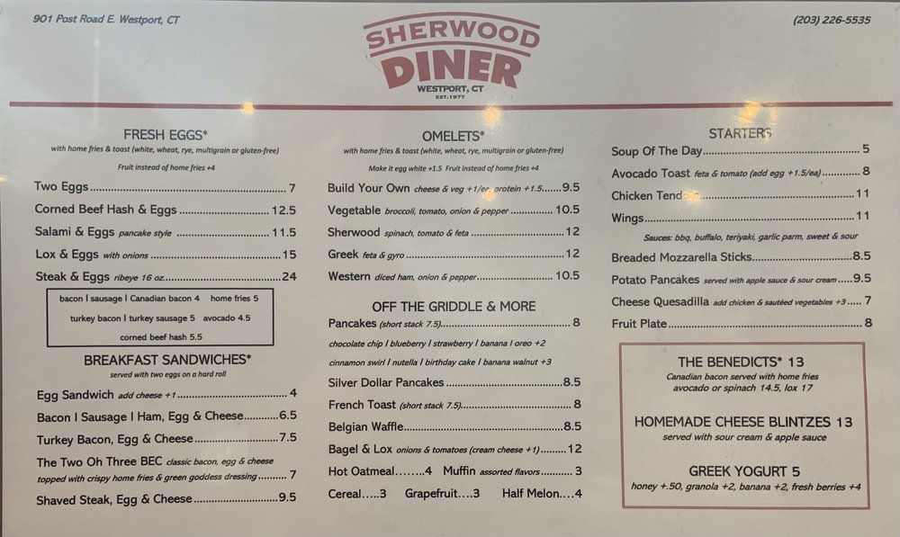 Sherwood Diner in Westport, CT, stands out as a top diner destination offering breakfast, brunch, and burger options. With a diverse menu including Western Sandwiches, Lobster Salad, and Grilled Calves Liver, there is something for everyone. The welcoming atmosphere, free Wi-Fi, and outdoor seating add to the experience. Customers praise the friendly staff, prompt service, and delicious food. Reviewers highlight favorites like the patty melts, Belgian waffles, and chicken waffles. Although portion sizes may leave you wanting more, the overall quality of the food and service make Sherwood Diner a must-visit spot. Don't miss out on their variety of drinks, including beer, wine, and milkshakes. Whether you're looking for a hearty meal or a quick bite, Sherwood Diner is sure to impress.